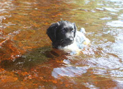 Vielä ennen kun pennut lähtivät meiltä kävimme pari kertaa tutustumassa metsään ja myös uimiseen. Eli autoilimme pentujen kanssa useaan kertaan ja ne pääsivät tutustumaan erilaisiin paikkoihin. Kesäpentujen kanssa voi tehdä niin paljon eri juttuja kun talvipentujen. Ainoa haitta oli tänä kesänä helle, eli useimmiten ulkoilimme oiken kunnolla vasta iltaisin. Olin ihan ihmeissäni kun pennut Amelia ja Kamu menivät reippaasti veteen ja ei kun suoraan uimaan. Tiku ja Hugo kahlailiat vedessä.